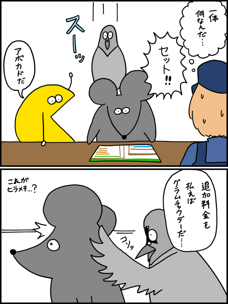 セットのドリンクは追加料金を払ってグラムチャウダーに変更できることを知るマウス。